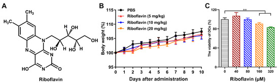 Biosafety of riboflavin in vivo and in vitro. (A) Chemical structure of riboflavin. (B) Riboflavin at different concentrations (5, 10, and 20 mg/kg body weight) was intranasally administered to mice. The body weight of the mice was monitored continuously for 10 days (n = 10/group). (C) The cytotoxicity of riboflavin (40 μM, 80 μM, 160 μM, and 320 μM) in DCs was detected by the CCK-8 assay. All of the data are presented as the mean ± SD. Statistical significance was assessed by one-way ANOVA to compare the results between different groups; ** p < 0.01.