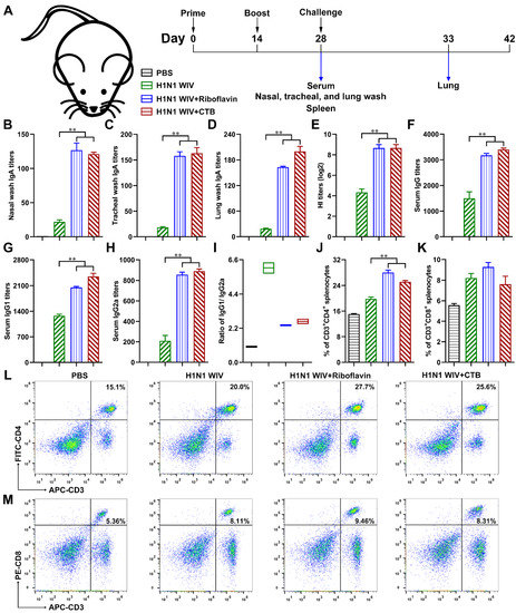 A total of 45 6 week old BALB/c mice were purchased, 40 of which were chosen for future study according to inclusion criteria based on equal mean body weight and healthy status. Mice (n = 10/group) were immunized intranasally with H1N1 WIV (1.75 µg hemagglutinin (HA)) alone or in combination with riboflavin (100 µg) or CTB (10 µg) two times at 0 and 14 days. Twenty-eight days after the primary immunization, the mice were euthanized. Nasal, tracheal, and lung lavage fluid samples were washed with 0.5, 0.2, and 0.5 mL of sterile PBS, respectively. Serum hemagglutination inhibition (HI) titers of the immunized mice were analyzed according to a previously described procedure [17]. Antigen-specific sIgA antibodies in mucosal washes (nasal, tracheal, and lung wash) and IgG (total IgG, IgG1, and IgG2a) in serum were detected by enzyme-linked immunosorbent assay (ELISA) as described previously [18]. Furthermore, splenic lymphocytes were isolated and analyzed to determine the percentages of CD3+ CD4+ and CD3+ CD8+ splenic T cells via FCM.