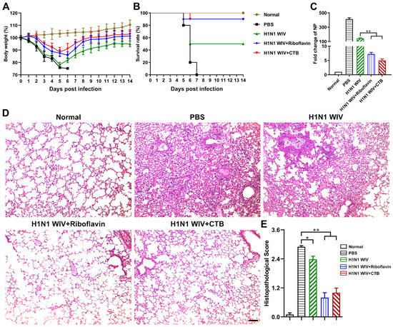 To verify the protective efficacy of intranasal vaccination with H1N1 WIV plus riboflavin, the immunized mice were intranasally challenged with 106 EID50 of H1N1 influenza virus (A/Puerto Rico/8/34) 28 days after the primary immunization. During the 14 day observation period, we found that the mice immunized with H1N1 WIV plus riboflavin recovered after a slight loss of body weight (Figure 3A), and their survival rate of 90% was same as that of the CTB group (Figure 3B). However, the mice in the H1N1 WIV alone group showed severe weight loss (Figure 3A) and their survival rate remained at 50% until the end of the 2 week infection (Figure 3B). Furthermore, the NP gene levels of H1N1 influenza virus in murine lungs were detected by qRT-PCR in order to evaluate the viral load. By 5 days p.i., the fold change of the NP gene in the H1N1 WIV plus riboflavin/CTB group was remarkably lower than that in the H1N1 WIV alone group (Figure 3C). Moreover, the pathological status of murine lung tissues was examined using an H&E staining method, which showed that the lung tissues from the PBS group exhibited severe pneumonia with inflammatory cellular infiltration, pneumonorrhagia, alveolar wall edema, and thickening on day 5 p.i. (Figure 3D,E). However, the lung tissues from the H1N1 WIV plus riboflavin/CTB group showed a slight histopathological change (Figure 3D,E). Accordingly, these observations indicate that riboflavin as a mucosal adjuvant significantly improves the protection level of the nasal influenza vaccine against H1N1 virus attack in mice.