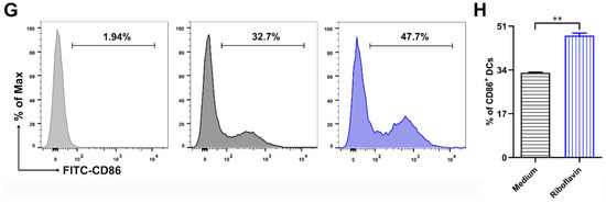 Next, to investigate whether riboflavin could activate DCs to enhance the downstream immune response, the expressions of phenotypic molecules were detected via FCM. After stimulation for 24 h with riboflavin, the expressions of MHCII (Figure 4A,B), CD40 (Figure 4C,D), CD80 (Figure 4E,F), and CD86 (Figure 4G,H) on DCs were significantly upregulated compared with those of the control. These results indicate that riboflavin improves the phenotypic maturation of DCs.