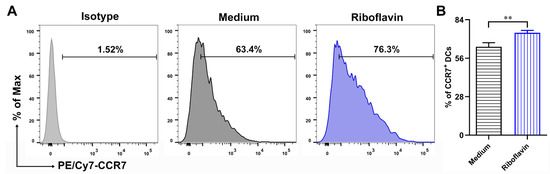Riboflavin enhances the expression of CCR7 in DCs. DCs were incubated with riboflavin (40 µM) for 24 h. (A) The expression of migration marker CCR7 was detected via FCM. (B) The percentage values are presented as the mean ± SD. Results are from one representative experiment out of three performed. Unpaired Student’s two-sided t-tests were employed to determine the differences between the two groups; ** p < 0.01.
