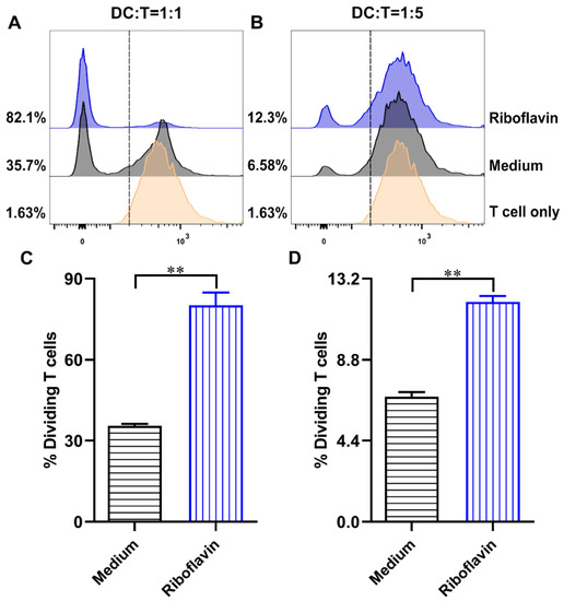 Riboflavin-induced DCs promote the proliferation of allogeneic CD4+ T cells. DCs were incubated with riboflavin (40 µM) for 24 h and then cocultured with CFSE-labeled CD4+ T cells in two graded cell numbers (DC/T-cell ratios: 1:1 (A) and 1:5 (B)). After 5 days, the proliferation of CD4+ T cells was detected via FCM. (C,D) The percentage values are presented as the mean ± SD. Results are from one representative experiment out of three performed. Unpaired Student’s two-sided t-tests were employed to determine the differences between the two groups; ** p < 0.01.