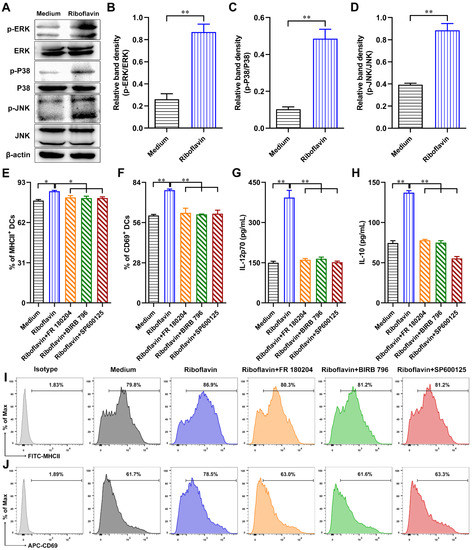 Riboflavin promotes DC maturation via the MAPK pathway. (A–D) DCs were incubated with riboflavin (40 µM) for 1 h, and then the expressions of p-ERK, ERK, p-P38, P38, p-JNK, JNK, and β-actin were detected by Western blot. (E–J) DCs were incubated with FR 180204 (ERK inhibitor, 10 µM), BIRB 796 (P38 MAPK inhibitor, 10 µM), or SP600125 (JNK inhibitor, 10 µM) for 2 h, followed by riboflavin for 24 h. The expressions of MHCII (E,I) and CD69 (F,J) in DCs were detected via FCM, and then the secretions of IL-12p70 (G) and IL-10 (H) in the supernatant were detected by ELISA. Results are from one representative experiment out of three performed. All of the data are presented as the mean ± SD. Statistical significance was assessed by unpaired Student’s two-sided t-tests or one-way ANOVA analysis to compare the results between the two groups or different groups, respectively; * p < 0.05, ** p < 0.01.