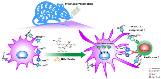 Schematic of the proposed mechanism by which riboflavin improves the immune response. Riboflavin first activated the MAPK signaling pathway, and then induced DC maturation, including through an activation marker (CD69), cytokine secretion (TNF-α, IL-1β, IL-12p70, and IL-10), phenotypic markers (MHCII, CD40, CD80, and CD86), a migration marker (CCR7), and the proliferation of allogeneic T cells. Furthermore, riboflavin enabled inactivated influenza nasal vaccine to trigger the downstream mucosal and systemic immune responses.