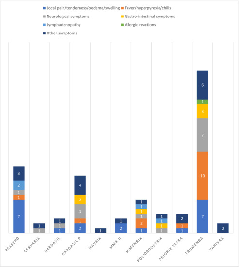 Trumenba was associated with the highest number of serious AEFIs, with seven serious adverse events having been deemed consistently related to the vaccine. In five out of seven cases (71.4%), fever was reported, and it was the only relevant symptom in two patients (28.6%). A patient (14.3%) also suffered from neurological symptoms, while another reported erythema and pain near the injection site; both symptoms were reported together with fever in a third patient. The only two patients (28.6%) for whom fever was not described suffered from loss of consciousness in one case and generalized urticaria-like rash in the other.