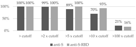 A level exceeding the cut-off values for both anti-S and anti-S-RBD antibodies was observed in 100% of subjects, and almost the same result was obtained when doubling the cut-off level (Figure 1). However, after setting the analysis to 5- and 10-fold cut-off levels, the percentage of subjects meeting this criterion was significantly higher for the anti-S-RBD measurement and exceeded 90%. This difference disappeared at the 100-fold cut-off level, with anti-S and anti-S-RBD achieving only 21% and 16%, respectively (Figure 1).