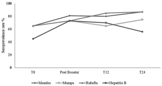 Trend of seroprotective rate against the four vaccines in HIV-infected children. The seroprotection rate increased for all vaccines after the booster dose administered to children negative at enrollment. A slight decrease is observed at T12 for measles due to one child who lost the protective antibodies after booster. A relevant reduction in the prevalence was observed for hepatitis B. The apparent increase in the seroprotective rate for mumps, rubella and measles at t 24 is due to a reduction in the number of patients still in follow-up.