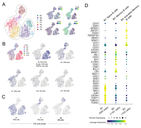 Identification of B-cell subpopulations by single cell-transcriptomics analysis. (A) The clusters of cells are represented on a tSNE plot based on the highly variable genes. The clusters are named as B1-B3 for B cells and P1-P4 for PB/PCs. The expression of the markers used for sorting the cells in the study is plotted on the tSNE plot. High expression of CD38 and CD27 marks the clusters P1-P4 as the PB/PCs. (B) Plotting tag information on the tSNE plot. The cells are assigned to each visit and cells at d0 are assigned to B cells and PB/PCs based on their location in B1-B3 and P1-P4 clusters, respectively. (C) Visualizing cell cycle scores on tSNE plot. G1, S and G2M cell-cycle scores are represented on the tSNE plot where P3 and P4 clusters comprise of S and G2M phase cells. (D) Dot plot of the gene markers used for identifying the B-cell subpopulations. B1: Naive B cells; B2: Memory B cells; B3: Activated memory B cells.
