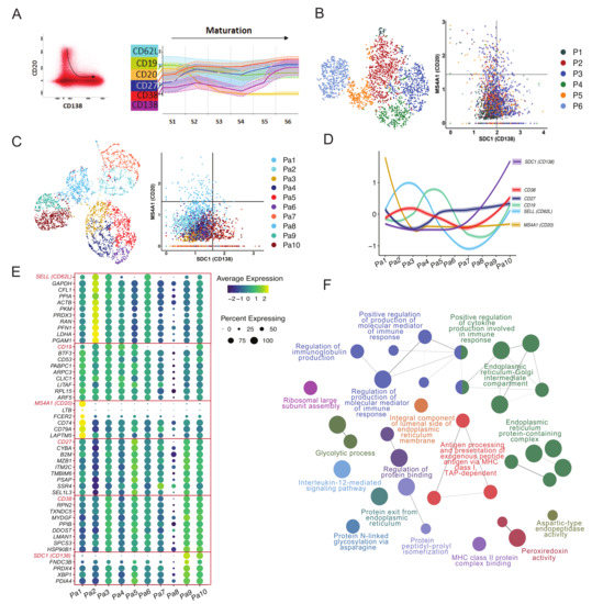 Previously, we used longitudinal flow cytometry data from 10 vaccinated donors to establish how expression of selected cell surface markers changes during maturation of PB/PCs [5]. To visualize the plasma cell maturation in the here studied donor, the PB/PCs data from days 0, 5, 7, 10 and 14 were merged in the Infinicyt software (Infinicyt™ Software v2.0, Cytognos) and the maturation was defined by the downregulation of CD20 and upregulation of CD138 (Figure 2A left panel). The most mature cells exhibited CD20-CD138+ phenotype. Then we traced changes in expression of four additional markers i.e., CD19, CD27, CD62L, and CD38. Based on the expression of all six markers, we drew new maturation pathways and divided it into six continuous maturation stages (Figure 2A right panel). Similar to flow cytometry staging, after removing B cells, PB/PCs were clustered based on all the genes and arranged with phenotype ranging from CD20+CD138- (less mature) to CD20-CD138+ (most mature) (Figure 2B). However, the cells from different clusters were mixed and the maturation based on P1-P6 clusters could not be drawn. Therefore, we clustered the PB/PCs again based on the expression of only 6 genes (SELL (CD62L), TNFRSF7 (CD27), SDC1 (CD138), ADPRC1 (CD38), MS4A1 (CD20) and B4 (CD19)) and used the expression of CD20 and CD138 to align the clusters with the maturation pathway of the PB/PCs. Herein, based on the maturation pathway defined by CD20 and CD138 markers, a trajectory from the blue-colored clusters (Pa1) to the dark red ones (Pa10) can be drawn (Figure 2C). Based on the maturation of clustered cells the staging of the PB/PCs was performed from Pa1-Pa10 and the expression of other markers was assessed (Figure 2D).