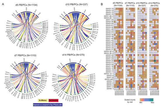 VJ gene usage in PB/PCs from all the post-vaccination visits relative to baseline. (A) Circos plot of VJ gene usage in PB/PCs from all the post-vaccination visits relative to baseline. Each ribbon represents a specific pairing between V and J genes, and the ribbon width represents the confidence bounds of the plotted data using the LOESS method. Ribbons color shows no change (yellow) or expanded links (dark blue) or new recombination events (red) as compared to d0 PB/PCs. (B) Heatmap plot of VJ gene usage in PB/PCs from all the post-vaccination visits.