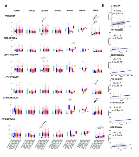 The selection processes and molecular events affect the V gene of IG heavy chain differently than the light chains [58,59] resulting in less diversity in the light chain repertoire [60]. Although we observed significant correlations between the mutations in V regions in heavy and light chain genes, the correlation was <45%. The high mutation rate in IGHV BCRs utilizing the IGHM class has been proposed as a mechanism of the immune system to maintain long-term memory to the vaccine [61]. Moreover, the high number of mutations in IGHG1 and IGHM genes in CDR and FR3 regions might also be associated with the maturation of IgG affinity during the response to the Boostrix vaccine. As the vaccine is a booster and only one individual was used for the pilot study, it might be difficult to assess the role of booster in affinity maturation processes.