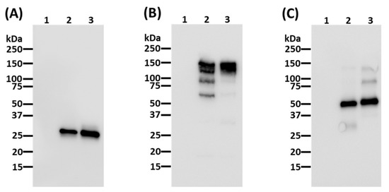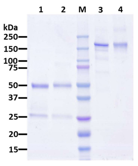 Agroinfiltration was used to transiently express the full heterodimeric IgG1 pIL6RmAb in N. benthamiana through the use of a geminivirus bean yellow dwarf virus-based vector system [21,22,32,33,34]. Expression of the fully assembled pIL6RmAb was monitored by Western blot analysis. Membranes probed for human kappa light chain (Figure 1A,B) and human gamma heavy chain (Figure 1C) show that both the light and heavy chain of the mAb are indeed expressed at the expected sizes and that the full heterotetramer of ~150 kDa is assembled correctly in the plants (Figure 1B). The expression level of IL6RmAb was estimated by ELISA and shown to be 55.95 µg/g fresh leaf weight (FLW) (Figure S1). This level of expression is higher than that previously reported for mAbs against SARS-CoV-2 spike protein produced in plants using the same plant expression vector [35]. The expression level can be improved by using newer versions of the vector that have been optimized for expressing mAbs in plants [36]. Plant-made IL6RmAb (pIL6RmAb) was isolated from soluble plant leaf protein extract and purified through Protein A affinity chromatography prior to further biochemical characterization [37]. As shown in Figure 2, pIL6RmAb was purified to high degree of homogeneity (~98%), comparable to typical, commercially available human IgG.