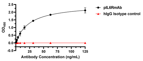 To confirm the authenticity and proper folding of pIL6RmAb, the specificity and affinity of pIL6RmAb in binding human IL-6R was assessed by ELISA in which IL-6R was immobilized to microtiter plate. As shown in Figure 3, pIL6RmAb bound IL-6R specifically with high affinity (KD = 0.083 nM) but did not show any binding to the human IgG isotype negative control. This binding affinity is comparable to the KD value reported for the mammalian cell-produced sarilumab (0.062 nM) [38]. Together, these results demonstrated that pIL6RmAb retained IL-6R binding specificity and affinity that are comparable to sarilumab.
