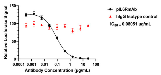 After verifying the purity, assembly, and IL-6R binding affinity of pIL6RmAb, the inhibitory activity of the mAb was analyzed. We used a well-established in vitro cell-based assay in which a luciferase reporter allows for the quantification of IL-6 signaling [38,39]. An inhibitory curve was obtained with serial dilutions of pIL6RmAb and an IC50 of 0.081 µg/mL (~0.54 nM) was calculated upon incubation with 25 ng/mL (~1.19 nM) of recombinant human IL-6, while human IgG (isotype IgG negative control) displayed no inhibition of IL-6 signaling (Figure 4). The IC50 value of pIL6RmAb is comparable to those of mammalian cell-produced sarilumab obtained by the same assay [38,39,40]. Thus, pIL6RmAb was confirmed to retain its binding to human IL-6R and inhibit the signaling of IL-6 in a predefined in vitro system.