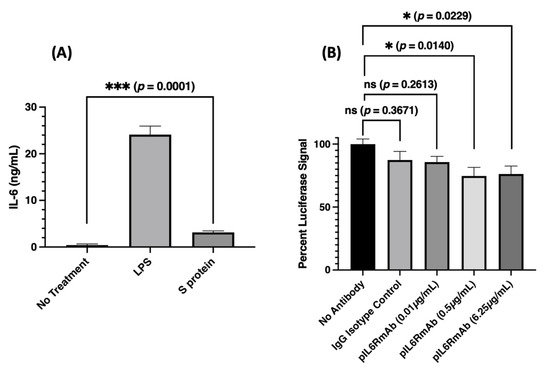 SARS-CoV-2 spike-protein stimulation of human PBMCs and inhibition of spike-protein-induced IL-6 signaling. (A) PBMCs were incubated for 72 h with LPS (200 ng/mL, stimulation positive control) or recombinant SARS-CoV-2 S protein (1 µg/mL). The supernatant was collected, and IL-6 concentration was determined by ELISA. (B) Luciferase reporter cells were pre-incubated with various concentrations of pIL6RmAb or an IgG isotype antibody negative control (6.25 µg/mL). The supernatant from S protein-stimulated PBMCs was then added to the cells. After 24 h of incubation, Luciferase-detecting reagent was added and the bioluminescent signal was measured. The percentage of luciferase signal relative to no antibody treatment is shown. Student’s t-test and one-way ANOVA were used for statistical analysis. At least three independent experiments were performed, and error bars represent standard error of the mean. *** indicates p values < 0.001 of IL-6 secretion by the S protein treated PBMCs compared to that of no treatment negative control. * and ns (not significant) indicate p values < 0.05 and > 0.05, respectively, of pIL6RmAb-treated samples compared to that of no treatment negative control.