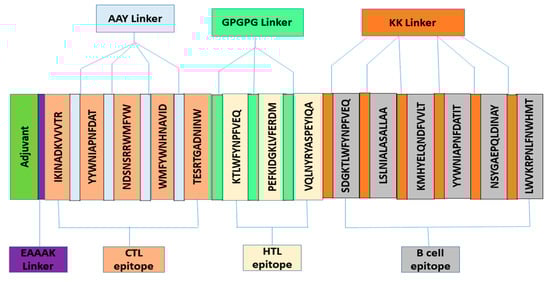 An adjuvant and linkers combined with the proposed epitopes result in the vaccine construct [40,41]. To increase the immunogenicity of the construct, the adjuvant is used very carefully. If the selection of peptides is performed on its own, then these could be poorly immunogenic [42]. Cholera enterotoxin subunit B (accession No.: P01556) was utilized as an adjuvant [43]. The EAAAK linkers were utilized to combine the first CTL epitope and adjuvant and to isolate the domains of a bi-functional fusion protein. For effective epitope functionality, a linker was used to bind two epitopes [44]. The AAY linker was combined with CTL, while GPGPG was linked with HTL for the successful construction of the vaccine construct and also for the identification of epitopes. The KK linker was combined with LBL epitopes to form a fusion peptide.