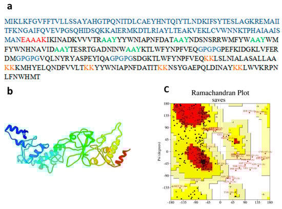 (a) Multi-epitope subunit vaccine construct’s sequence, where blue color indicates adjuvant, red color represents EAAAK linker, lime color shows AAY linker, blue color depicts GPGPG, orange color exhibits KK linker and the black color indicates of CTL, HTL, and B-Cell Epitopes (b) Refine 3D structure of vaccine construct. (c) Ramchandran plot to check the quality of vaccine construct.