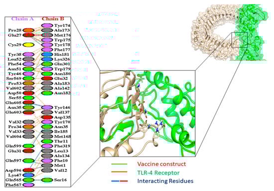 Docked complex of TLR4 receptor with the vaccine receptor indicating the interacting part along with the interacting residue.