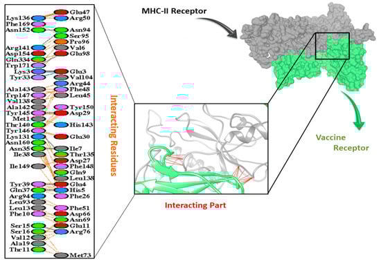 After the interaction of the host’s immune cells with the vaccine, an effective immune response is generated. Molecular docking was performed to observe the binding ability of the vaccine with the receptors of the human immune cells. The stimulating and antibacterial immune response was analyzed by observing the TLR4, MHC-I and MHC-II receptors. Later, by employing the HADDOCK-v-2.4 server, the unique protein-to-protein interaction was determined [54]. To model the biomolecular complexes, HADDOCK was used. For the visualization of the docked complexes, PyMOL-v.1.3 was utilized [54]. PDBsum, an online server, was used for analyzing the interactions among docked complexes [55].