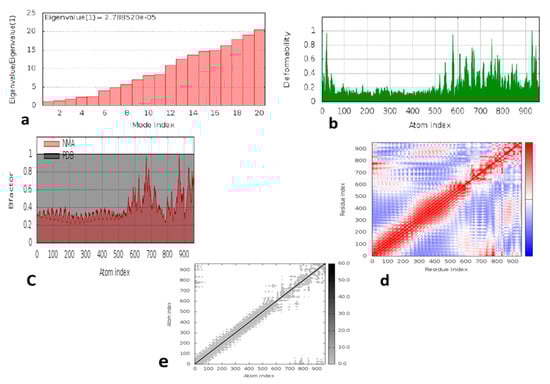 Protein mobility and stabilization were examined using a large-scale normal mode analysis (NMA). Relying on internal coordinates of the docked complex, the iMODS-server was used for this evaluation. The deformability of the complex was determined by the distortion of the individual residue, as is shown by the hinges of the chain (Figure 8b). The value of the complex was calculated as 2.788520 × 105, (Figure 8a). The eigenvalue of each normal mode was determined by reversing the variance associated with it [62]. The value of the B-factor was proportional to RMS due to the normal mode analysis (Figure 8c). A covariance matrix represents the pairings of the residue pairs, with different pairs of correlated, dis-associated, or irrelevant motions represented in different colors such as reddish, bluish and white (Figure 8d). The elastic map depicts joint atoms linked by springs, with every single point showing one spring and the grey color representing stiffer areas, with intensity being proportional to stiffness (Figure 8e).