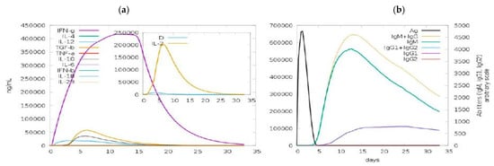 In silico immune responses of the vaccine as an antigen: (a) immunoglobulin generation and B-cell isotypes following exposure in different states with the Simpson index to the antigen; (b) development of cytokine, interleukins.