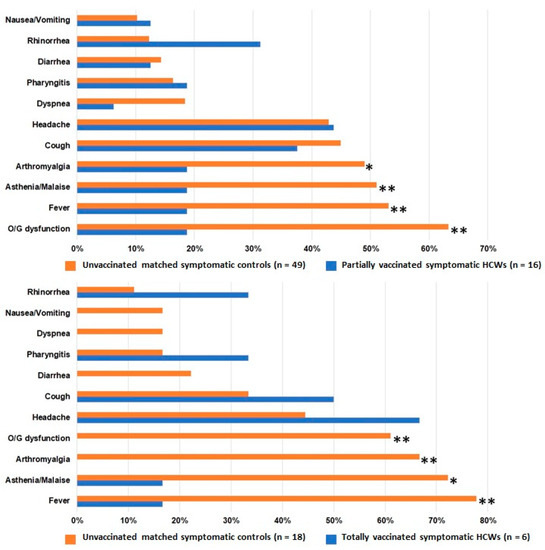 Comparison of COVID-19-related signs and symptoms between partially and totally vaccinated symptomatic health care workers and corresponding unvaccinated age- and sex-matched controls. ** p value < 0.05; * trend for statistical significance. Legend: HCWs, health care workers; O/G dysfunction, olfactory and/or gustatory dysfunction.