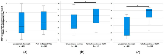 Comparison of SARS-CoV-2 PCR cycle threshold values across the study population. Comparison of PCR cycle Table 2. diagnosis between corresponding unvaccinated sex- and age-matched controls and post-first dose vaccinated health care workers (a), partially vaccinated health care workers (b), and totally vaccinated health care workers (c). Legend: HCWs, health care workers, PCR, polymerase chain reaction. * Significant differences (p < 0.05) were highlighted.