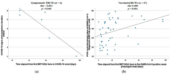 THCWs showed higher prevalence of asymptomatic infections, and higher Ct values at diagnosis compared to controls (Table 1; Figure 1 and Figure 2). The time elapsing from COVID-19 onset to swab collection was not different between THCWs and controls (median 3 versus 3 days, p = 0.98; Table 1). Symptomatic THCWs presented less signs and symptoms, a pattern of COVID-19 with lower prevalence of complaints related to systemic illness (fever, arthromyalgia, asthenia, and malaise), and a shorter duration of signs and symptoms length (median 5 versus 9 days, p = 0.028; Table 1), which inversely correlated with the time elapsed from first vaccine dose to COVID-19 onset (rho −0.832, p = 0.040; Figure 3). This correlation was not observed among symptomatic PHCWs (rho 0.251, p = 0.348).