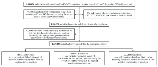 Figure 1 depicts the study cohort. Of the 1,356,076 individuals aged 18 years or older with confirmed SARS-CoV-2 infections from 1 April 2021 to 15 September 2021, 1,286,881 were eligible for the study population. Study participants were classified into three groups: unvaccinated (did not receive any doses of AZD1222, BNT162b2, or CoronaVac), partially vaccinated (≥1 day after the receipt of the first dose of any of the three vaccines until before the receipt of the second dose), and fully vaccinated (≥14 days after the receipt of the second dose of any of the three vaccines).