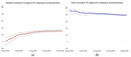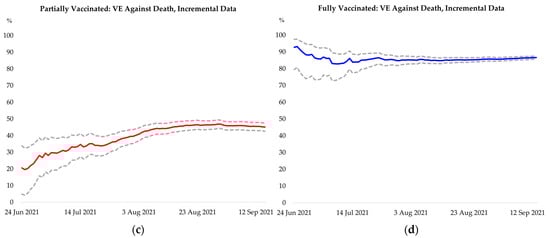 Robustness check for overall effectiveness of partial and full vaccination over the study period, with line plots representing the effectiveness for COVID-19-related ICU admission and death estimated with data from 1 April 2021 up to the corresponding day on the horizontal axis; dotted lines show the 95% confidence interval. (a) Effectiveness of partial vaccination against ICU admission; (b) Effectiveness of full vaccination against ICU admission; (c) Effectiveness of partial vaccination against death; (d) Effectiveness of full vaccination against death.