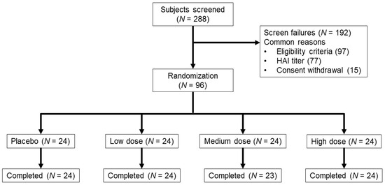 From June 2016 through September 2016, 288 subjects were screened. The most common reasons for screen failure (n = 192) were not meeting one or more of the eligibility criteria and/or high HAI titers (Figure 1). Demographic and baseline characteristics among the 96 enrolled subjects were well-balanced across the treatment groups (Table 1). One subject in the medium-dose group was lost to follow up after day 2. This subject was included in safety analyses up to day 2 but not in immunological analyses. The proportions of subjects in each baseline HAI category (<10, ≥10 to <40, and ≥40) were similar between the low and medium-dose treatment groups and placebo. More subjects (46%) had a baseline HAI ≥40 in the high-dose group compared to placebo, low and medium-dose groups (25%, 31%, 33%, respectively), but the differences were not statistically significant.
