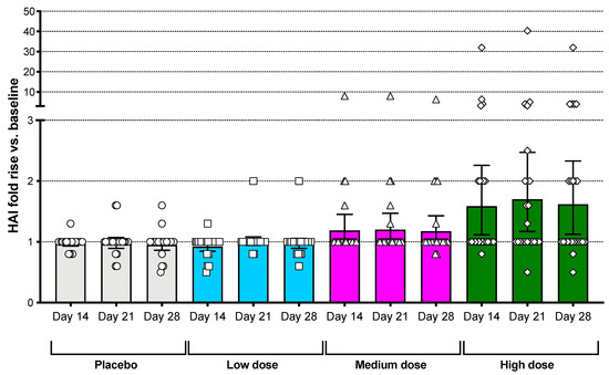 The following are available online at https://www.mdpi.com/article/10.3390/vaccines9121388/s1, Supplemental Data, Table S1: Overall Summary of Adverse Events (Safety Set); Table S2: Most Frequent Treatment-Related Treatment-Emergent Adverse Events; Table S3: Seroconversion at Day 28 by Treatment Group and Baseline HAI Titer; Table S4: Seroprotection at Day 28 by Treatment Group and Baseline HAI Titer; Figure S1: Nasal shedding (RT-PCR).
