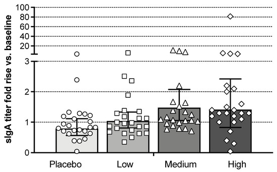 Influenza A/Brisbane/10/2007 HA-specific secretory IgA (sIgA) responses in nasal swabs. Shown are fold increase in HA-specific sIgA titer normalized to total IgA on day 28 post-vaccination over baseline. Bars represent the geometric mean ELISA titer with error bars showing the 95% confidence interval. Each symbol represents an individual subject.