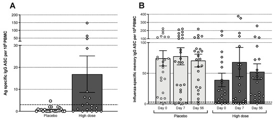(A) Quantities of circulating influenza virus-specific antibody-secreting cells on day 7 post-vaccination. ASC: antibody-secreting cell. PBMC: peripheral blood mononuclear cells. Bars represent the mean with error bars showing the standard error. Number of samples analyzed: 19 for high-dose M2SR and 23 for placebo. (B) Influenza virus-specific memory B cells in circulation before, 7 and 56 days after vaccination. PBMC from M2SR high-dose and placebo cohorts were tested in memory B cell (IgG) ELISpot assay after four days of stimulation with B-Poly-STM for polyclonal expansion of memory B cells. Results over 3 per 106 (dashed line) were considered above background.