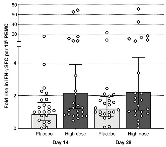 T-cell immune responses. PBMCs collected at baseline and on days 14 and 28 were analyzed by ELISpot assay for the secretion of IFN-γ upon stimulation with influenza-specific class 1 peptides. SFC: spot-forming cells. Bars represent the geometric mean with error bars.