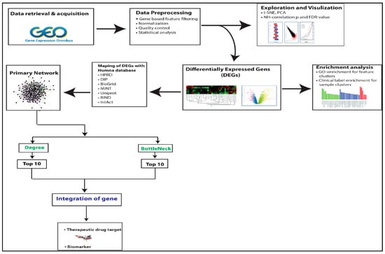The network’s topological features are the first and most crucial foundational analysis—topological analysis aids in comprehending a network’s structure, making the underlying mechanisms easier to understand. The topological features of the PPI network of DEGs are determined by utilizing the Cytoscape plugins Network Analyzer [] and Cytohubba [] to quantify degree (k), betweenness centrality (CB), and bottleNeck (BN). The network features were examined to determine the network’s essential behaviours [,,,,,].