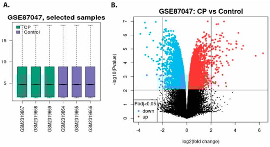 According to the methodology section’s inclusion and exclusion criteria, microarray gene expression profiles with accession number GSE870476613 were selected containing expression data from intestinal epithelial tissue infected with C. parvum infection (Table S1). To identify DEGs between C. parvum infected patient and healthy control, we used GSE87047 datasets. The volcano plot and box plot of healthy and C. parvum infection for tissue samples are shown in Figure 2A. We found 163 DEGs, of which 109 up and 54 down-regulated DEGs from the samples of C. parvum infected tissue, and healthy control sets were compared after applying the statistical threshold of log2 (fold change) BH-p-value.