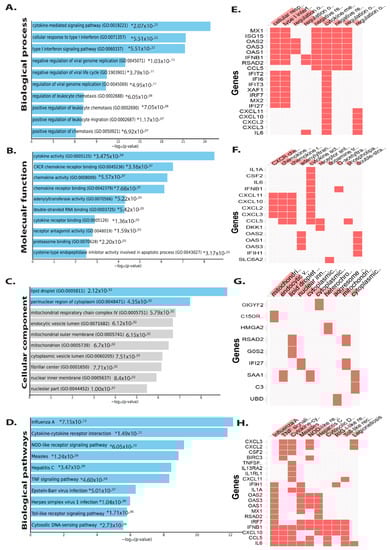 Molecular function analysis suggests that cytokine receptor binding and activity, CXCR chemokine receptor binding, chemokine activity, receptor binding, adenylyl transferase, receptor antagonist activity, and proteasome binding interleukin-6 receptor binding, cAMP-dependent protein kinase regulator activity, and growth factor activity were all abundant (Figure 3B). Changes in cellular component upregulated DEGs were seen in the lipid droplet, perinuclear region of cytoplasm, mitochondrial respiratory chain complex, endocytic vesicle lumen, mitochondrial outer membrane, mitochondrion, cytoplasmic vesicle lumen, fibrillar center, and nuclear inner membrane, among other places (Figure 3C). Biological pathway analysis revealed that the upregulated DEGs were mainly enriched in influenza A, cytokine–cytokine receptor interaction, Hepatitis B and C, TNF, Toll-like receptor, and IL-17 NF-kappa B, chemokine, JAK-STAT signaling pathway, arthritis Salmonella infection, rheumatoid and tuberculosis (Figure 3D).