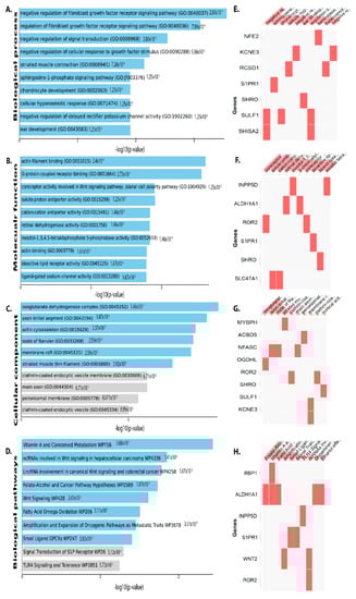 DEGs that have been downregulated are classified using gene ontology. Plots of the log-p value and the enriched enrichr-based combination score. The p value indicates the significance of enrichment and the number of genes/proteins in the category. Using downregulated genes, Clustergram was generated by Enrichr. Genes associated with each term are indicated by the red cells in the matrix, depicting top 10 enriched terms with p-value < 0.05 (A) Biological process (B) Molecular function (C) Cellular component and (D) Biological pathway. (E) Clustergrams display the genes associated with the top 10 biological processes in red cells in a matrix. (F) In clustergram, the red cells in the matrix indicate the genes associated with the top 10 significant molecular function. (G) In clustergram, the red cells in the matrix indicate the genes associated with the top 10 important cellular components. (H) Clustergrams display the genes related to the top 10 biological pathways in red cells in a matrix.