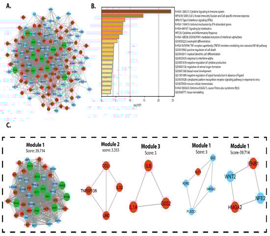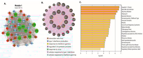 PPI networks were designed, displayed, and analyzed using Cytoscape software v.3.4.0 and the STRING v.10.5 database. The DEG PPI network was created (Figure 5A), and the essential module was found using Cytoscape (Figure 5B). The topological network properties of DEGs in intestinal epithelial tissue of a C. parvum infected patient were analyzed using network analyzer and cytohubba (cytoscope plugin), (Table S3). Metascape was used to perform functional analysis of genes involved in this module []. We found that the genes in module 1 were mainly enriched in positive control of cell death, TNFSF members mediating non-canonical NF-kB pathway, neutrophil differentiation, DDX58/IFIH1-mediated activation of interferon-alpha/beta, cytokines, and inflammatory response. Interleukins signaling Type-II interferon signaling (IFNG), SARS-CoV-2 innate immunity evasion and cell-specific immune response, cytokine signaling in the immune system, antiviral mechanism via IFN-stimulated genes.