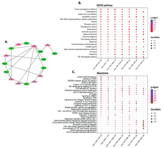 Hub genes and differentially expressed miRNAs are among the MIENTURNET network analysis outcomes. (A) MiRNA-hub genes target network visualization, with green triangular circles representing miRNAs and pink circles indicating hub genes miRNAs. (B) Based on the enrichment analysis target hub genes for the top ten differentially expressed miRNAs, a dot plot of functional enrichment analysis for the top ten differentially expressed miRNAs. The top 10 differentially expressed miRNAs were chosen for functional enrichment analysis. On the x-axis, selected miRNAs are illustrated, while KEGG pathways results are shown on the y-axis. The size of the dots reflects the gene ratio, and the colour of the dots indicates the adjusted p-value (FDR) (number of miRNA targets found enriched in each category over the number of total genes associated with that category). (C) The pathways of the reactome.