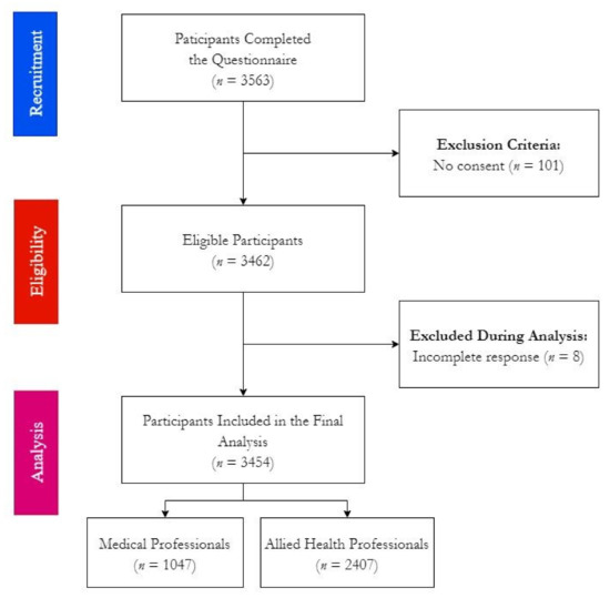 Until 11 November 2021, 3563 responses were received, of which 101 were excluded because the participants did not consent to participate in the study after reading the informed consent, constituting 2.8% as a non-repose rate. Later, eight responses were removed due to incomplete data, leading to a final sample of 3454 participants being included in the final analyses (Figure 1).