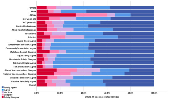 When asked about their attitudes towards receiving COVID-19 vaccine BDs, 71.3% indicated their acceptance (“totally agree” and “agree”), 12.2% were hesitant (“not sure”), and 16.5% disclosed their rejection to receive the BD (“totally disagree” and “disagree”). MP (77.7%), male (79.3%), and >47 year-old participants (76.5%) had significantly (Sig. < 0.001; <0.001; and <0.001) higher levels of BD acceptance than AHP (68.6%), female (69.7%), and ≤47 year-old participants (66.3%), (Figure 3).
