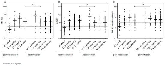 Comparison of cells producing IFNγ (A), IL-2 (B), or both IFNγ and IL-2 (C) measured as stimulation index by ELISpot after stimulation with SARS-CoV-2 antigens at different time points following vaccination (cohort 1) or infection (cohorts 2 and 3). Horizontal bars indicate mean values. The dotted line shows the lower cut-off of SI = 3, below which all results are negative. * indicates significant differences with p < 0.05, n.s. indicates non-significant differences.