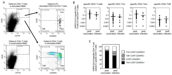 Comparison of SARS-CoV-2-specific memory CD4+ T-cell subsets following vaccination and infection. (A) Gating strategy: expression of CD25 and CD134 on CD4+ T-cells from stimulated (above left) or unstimulated (below left) PBMC from a representative vaccinated staff member. The percentages of SARS-CoV-2-specific CD4+ T-cells were calculated by subtracting the values of CD25hiCD134hi cells in gate P3 of stimulated PBMC from unstimulated PBMC. The whole CD4+ T-cell gate from stimulated PBMC was used set quadrants on T-cell subsets based on CCR7 and CD45RO expression (below right). Applying these quadrants to cells in the stimulated CD25hi CD134hi gate P3 allowed quantification of SARS-CoV-2-specific memory CD4+ T-cell subsets as percentage of specific CD4+ T-cells (above right). (B) Comparison of the frequencies of SARS-CoV-2-specific CD4+ T-cells, specific central memory CD4+ T-cells (Tcm), specific effector memory CD4+ T-cells (Tem), and specific effector T-cells (Teff) as a percentage of total CD4+ T-cells three months after vaccination and infection. Horizontal bars indicate mean values. (C) Comparison of the proportions of memory T-cell subsets as percentage of SARS-CoV-2-specific CD4+ T-cells at three months after vaccination and infection.
