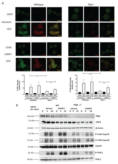 Next, we aimed to evaluate the role of SHP1 in association with DLG1 in T cell signaling. For this, we re-analyzed the microcluster dynamics in Jurkat cells. Wild-type and DLG1 knockout Jurkat cells were treated with an siRNA against SHP1. After 48 h, the cells were placed onto an anti-CD3- or anti-CD45-coated surface and microclusters were analyzed. After SHP1 siRNA treatment, wild-type cells showed a modest increase in P-ZAP70 and P-TCR ζ signal intensity. On the other hand, the decreased signal intensity in activated DLG1 KO cells was rescued after SHP1 siRNA treatment (Figure 4A).