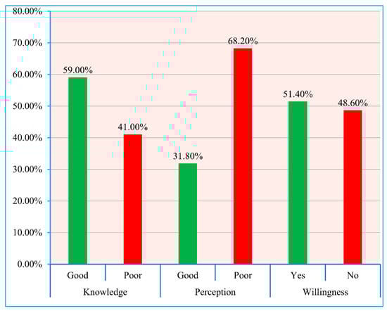 Percentage distributions of knowledge (good and poor), perception (good and poor), and willingness (yes and no) for taking COVID-19 vaccine among Bangladeshi population. All respondents’ scores were calculated through descriptive statistics and categorized into good knowledge and perception (if the participants’ score was greater than or equal to the mean value) and poor knowledge and perception (if the participants’ score was less than the mean value) [28].