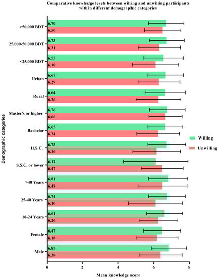 Comparative knowledge levels between willing and unwilling participants within different demographic categories expressed in terms of mean ± standard deviation.