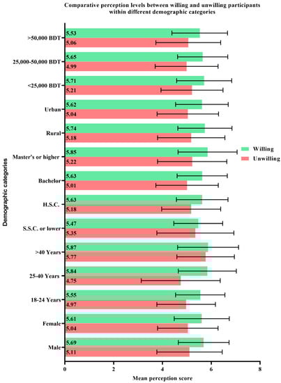 Comparative perception levels between willing and unwilling participants within different demographic categories expressed in terms of mean ± standard deviation.