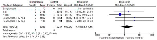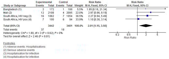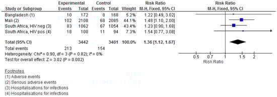 - Maternal non-influenza infectious adverse events. This outcome was recorded as hospital admission in the South African trial [27], as serious adverse events in the Bangladesh and Mali trials [24,26]; the Nepal trial did not report this outcome [25]. We did not include TB and HIV, as we assumed that these were acquired before enrolment. Both the South African and Mali trials reported categories of non-mutually exclusive outcomes, so one individual could account for several outcomes, but based on the reported data from South Africa, the number of outcomes was not much larger than the number of individuals (316 all-cause hospitalisations in 304 women; 313 all-cause hospitalisations in 289 infants).